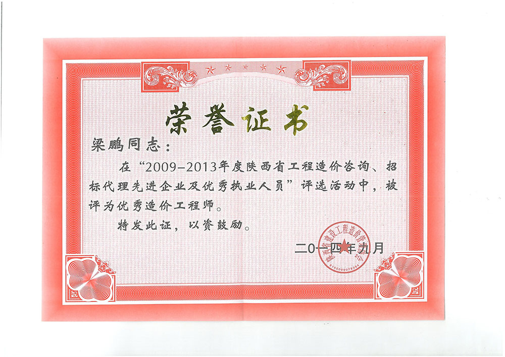 公司總經理梁鵬同志在“2009-2013年度陜西省工程造價咨詢、招標代理先進企業(yè)及優(yōu)秀執(zhí)業(yè)人員”評選活動中,被評為優(yōu)秀造價工程師。