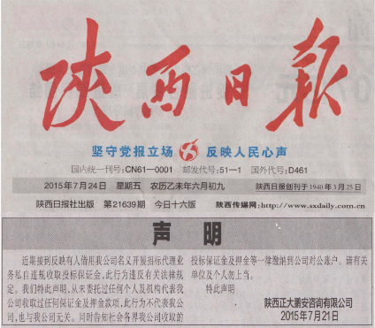 2015年7月21日,我公司在《陜西日?qǐng)?bào)》上刊登聲明的截圖。