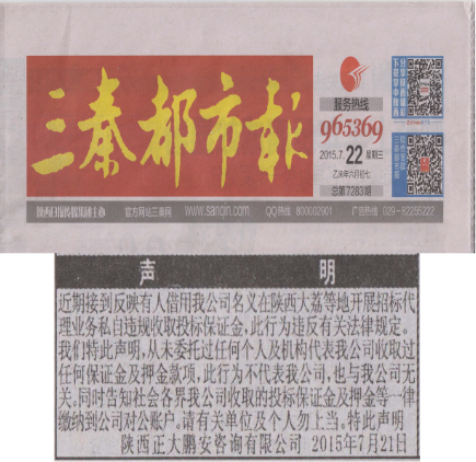 2015年7月21日,我公司在《三秦都市報(bào)》上刊登聲明的截圖。