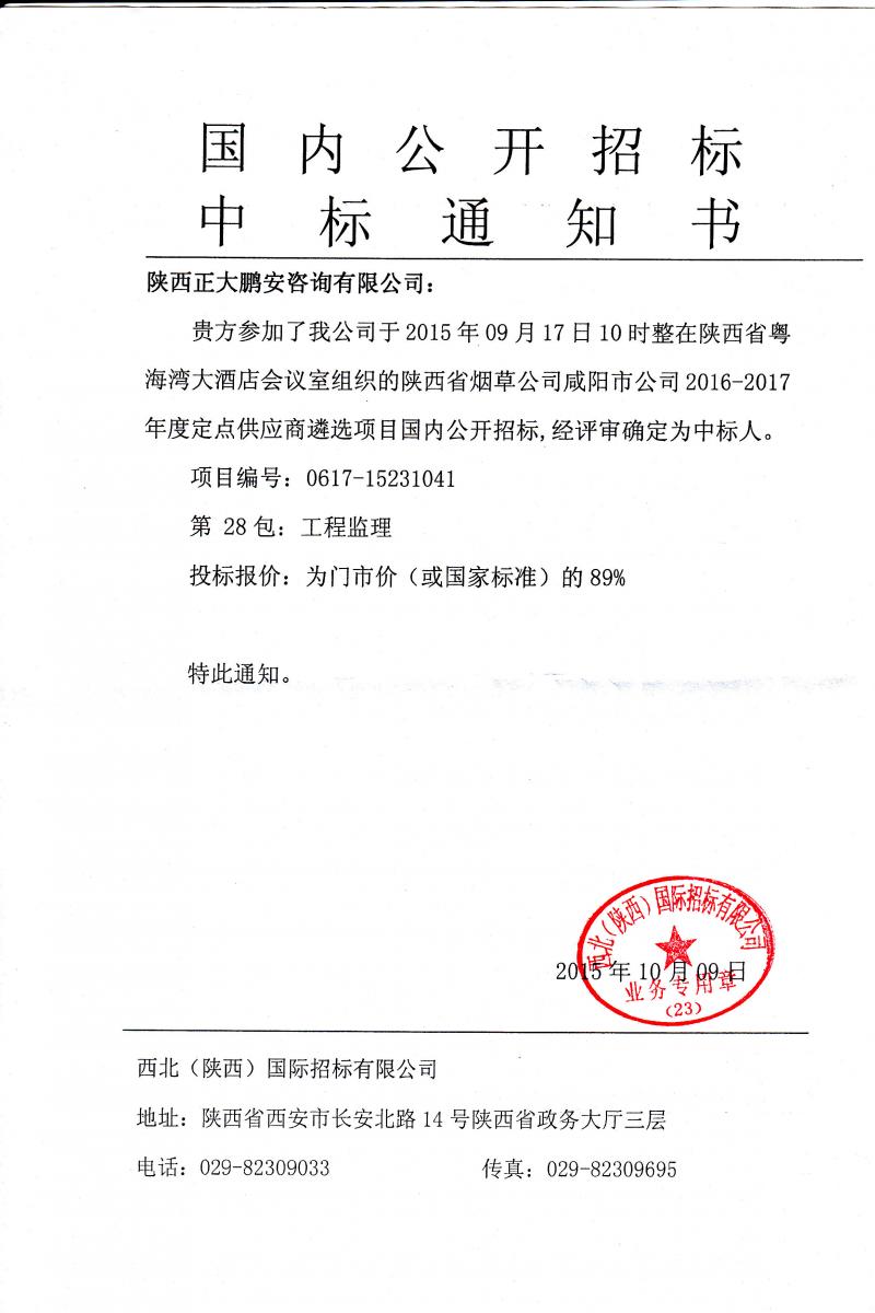 正大鵬安入圍陜西省煙草公司咸陽市公司2016-2017年度定點供應(yīng)商遴選項目