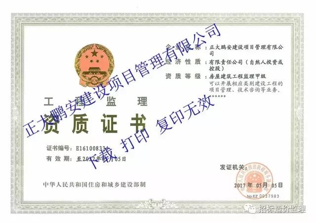 2017年5月5日,從國家住建部網(wǎng)站獲悉:正大鵬安建設(shè)項目管理有限公司房屋建筑工程監(jiān)理資質(zhì)升為甲級。