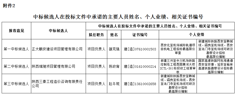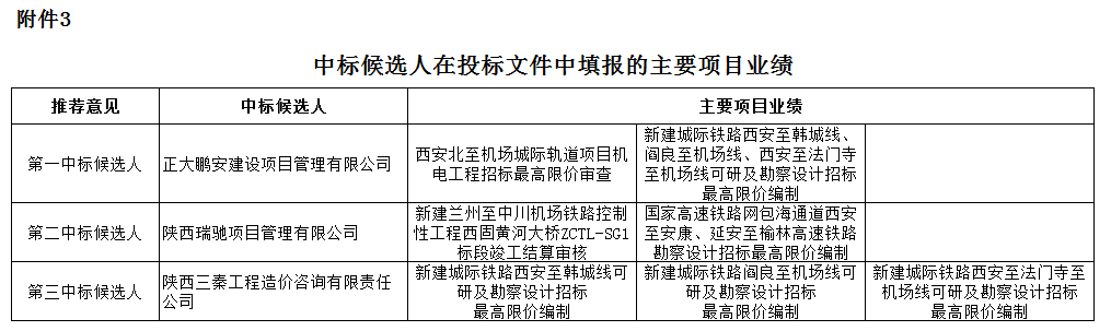 新建城際鐵路西安至潼關(guān)線、法門寺至寶雞線勘察設計和費用審核及機場經(jīng)西安南至西安東線、渭南至蒲城線可行性研究招標最高限價編制詢價在國內(nèi)進行公開招標。項目法人陜西省鐵路集團有限公司組織完成了評標工作?,F(xiàn)將中標候選人單位公示如下:
