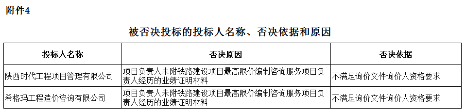4.被否決投標的投標人名稱、否決依據(jù)和原因。