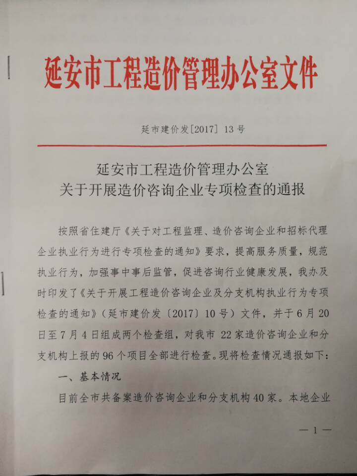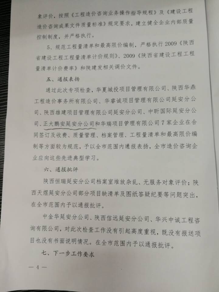 正大鵬安公司延安分公司受到延安市造價(jià)辦的通報(bào)的表彰