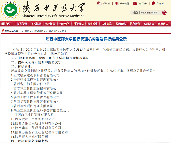 正大鵬安中標(biāo)陜西中醫(yī)藥大學(xué)招標(biāo)代理機(jī)構(gòu)遴選項(xiàng)目