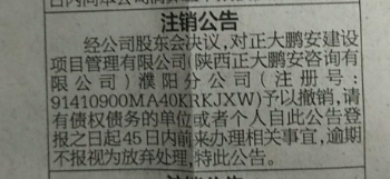 經(jīng)公司股東會(huì)決議,正大鵬安建設(shè)項(xiàng)目管理有限公司濮陽分公司(注冊(cè)號(hào)91410900MA40KRKJXW)予以注銷,請(qǐng)有債權(quán)債務(wù)的單位或個(gè)人自登報(bào)之日起45日內(nèi)前來辦理相關(guān)事宜,逾期不報(bào)視為放棄處理,特此公告。