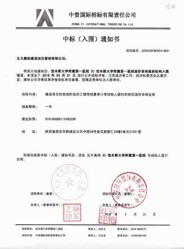 正大鵬安中標佳木斯大學附屬第一醫(yī)院造價咨詢服務項目