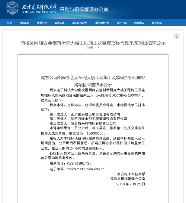 西安電子科技大學(xué)南校區(qū)網(wǎng)絡(luò)安全創(chuàng)新研究大樓工程施工及監(jiān)理招標(biāo)代理采購項目采購結(jié)果公示(采購編號XDCGB-G-18009),結(jié)果公示如下: