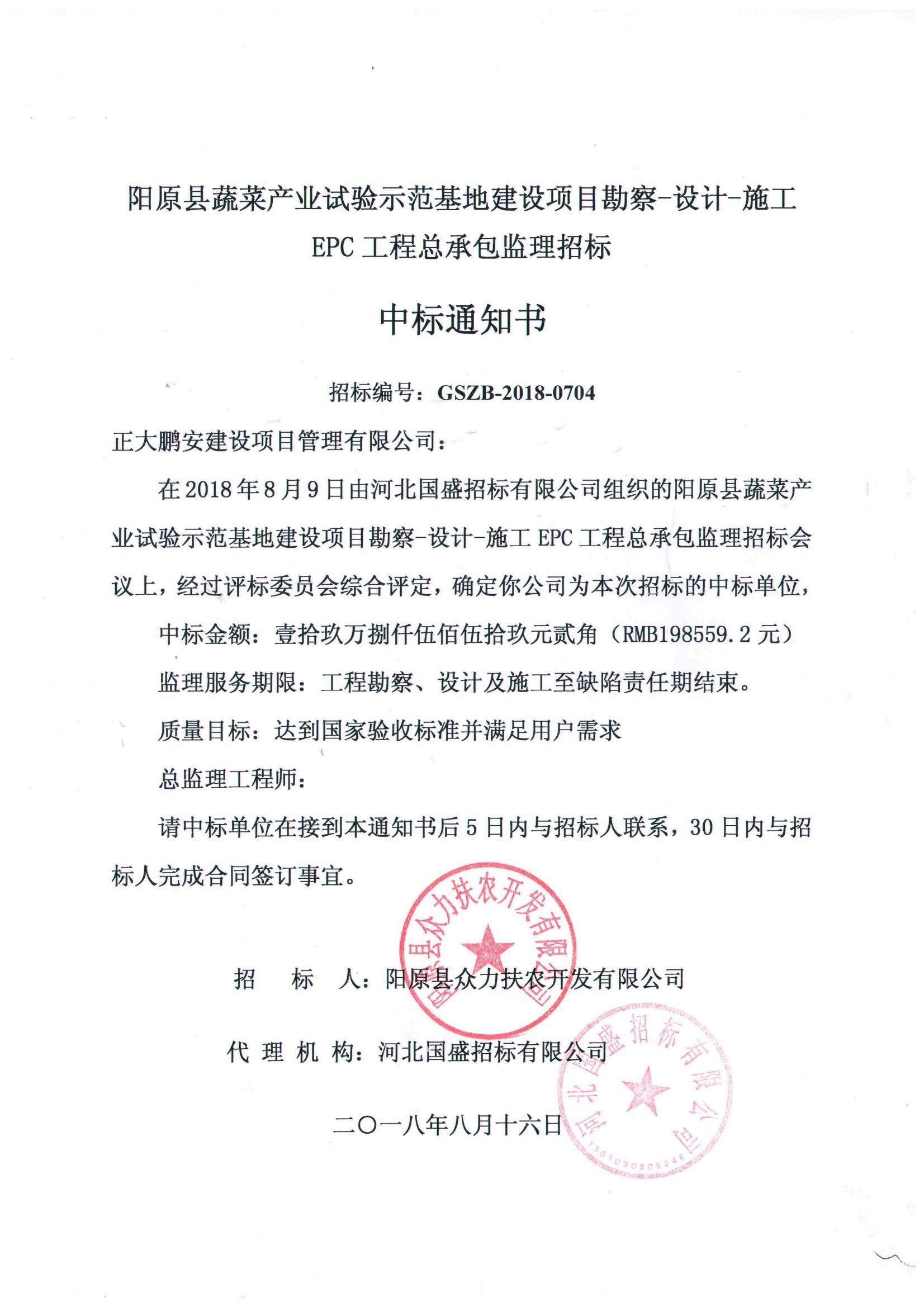 正大鵬安中標(biāo)陽原縣蔬菜產(chǎn)業(yè)試驗示范基地建設(shè)項目監(jiān)理