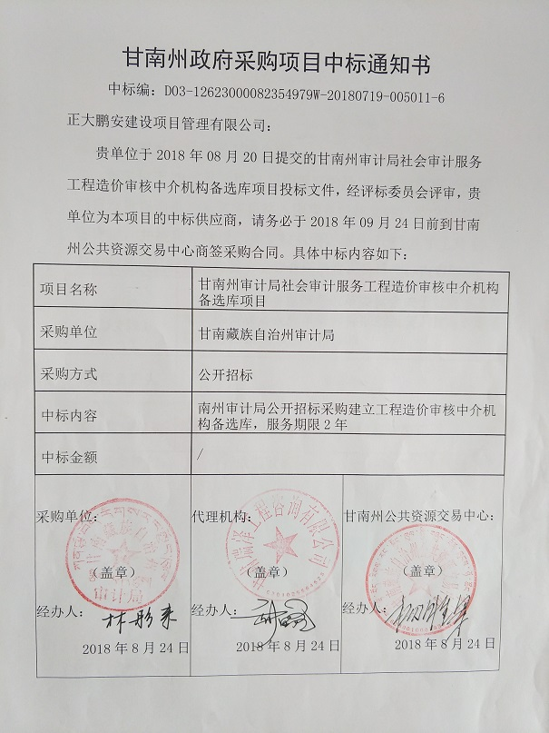 2018年8月,經(jīng)評(píng)標(biāo)委員會(huì)綜合評(píng)審,招標(biāo)人確認(rèn),正大鵬安建設(shè)項(xiàng)目管理有限公司中標(biāo)甘南州審計(jì)局社會(huì)審計(jì)服務(wù)工程造價(jià)審核中介機(jī)構(gòu)備選庫(kù)項(xiàng)目。