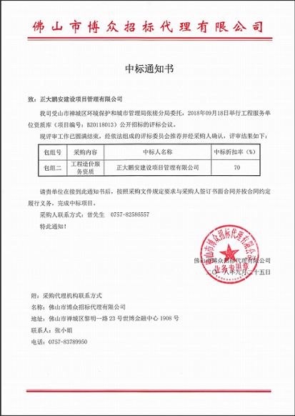 2018年9月,經(jīng)評標委員會綜合評審,招標人確認,正大鵬安建設(shè)項目管理有限公司中標佛山市禪城區(qū)環(huán)境保護和城市管理局張槎分局工程造價服務資質(zhì)入圍項目。