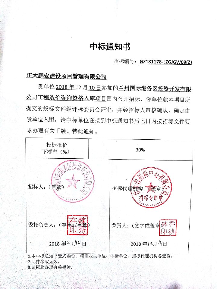 2018年12月14日,經(jīng)評(píng)標(biāo)委員會(huì)綜合評(píng)審,招標(biāo)人確認(rèn),正大鵬安建設(shè)項(xiàng)目管理有限公司中標(biāo)蘭州國(guó)際港務(wù)區(qū)投資開發(fā)有限公司工程造價(jià)咨詢資格入庫(kù)項(xiàng)目。