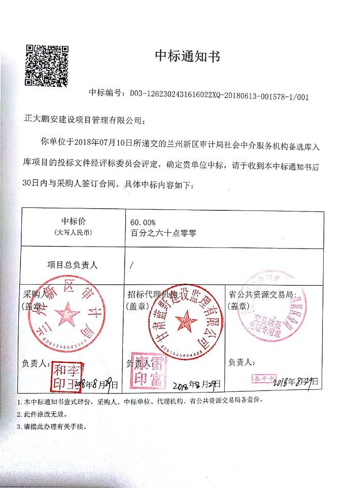 正大鵬安中標蘭州新區(qū)審計局社會中介服務(wù)機構(gòu)備選庫入庫項目