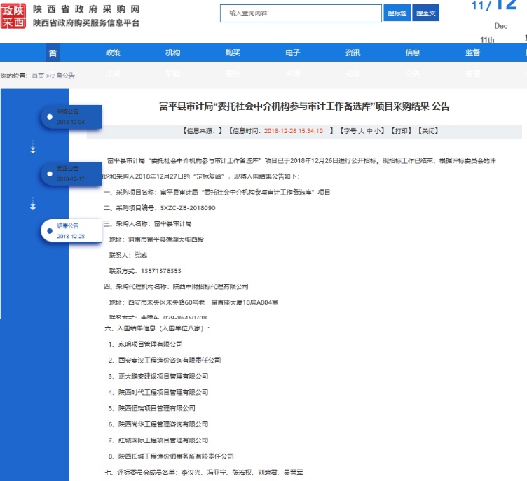 2018年12月8日,經(jīng)評(píng)標(biāo)委員會(huì)綜合評(píng)審,招標(biāo)人確認(rèn),正大鵬安建設(shè)項(xiàng)目管理有限公司中標(biāo)富平縣審計(jì)局“委托社會(huì)中介機(jī)構(gòu)參與審計(jì)工作備選庫(kù)”項(xiàng)目