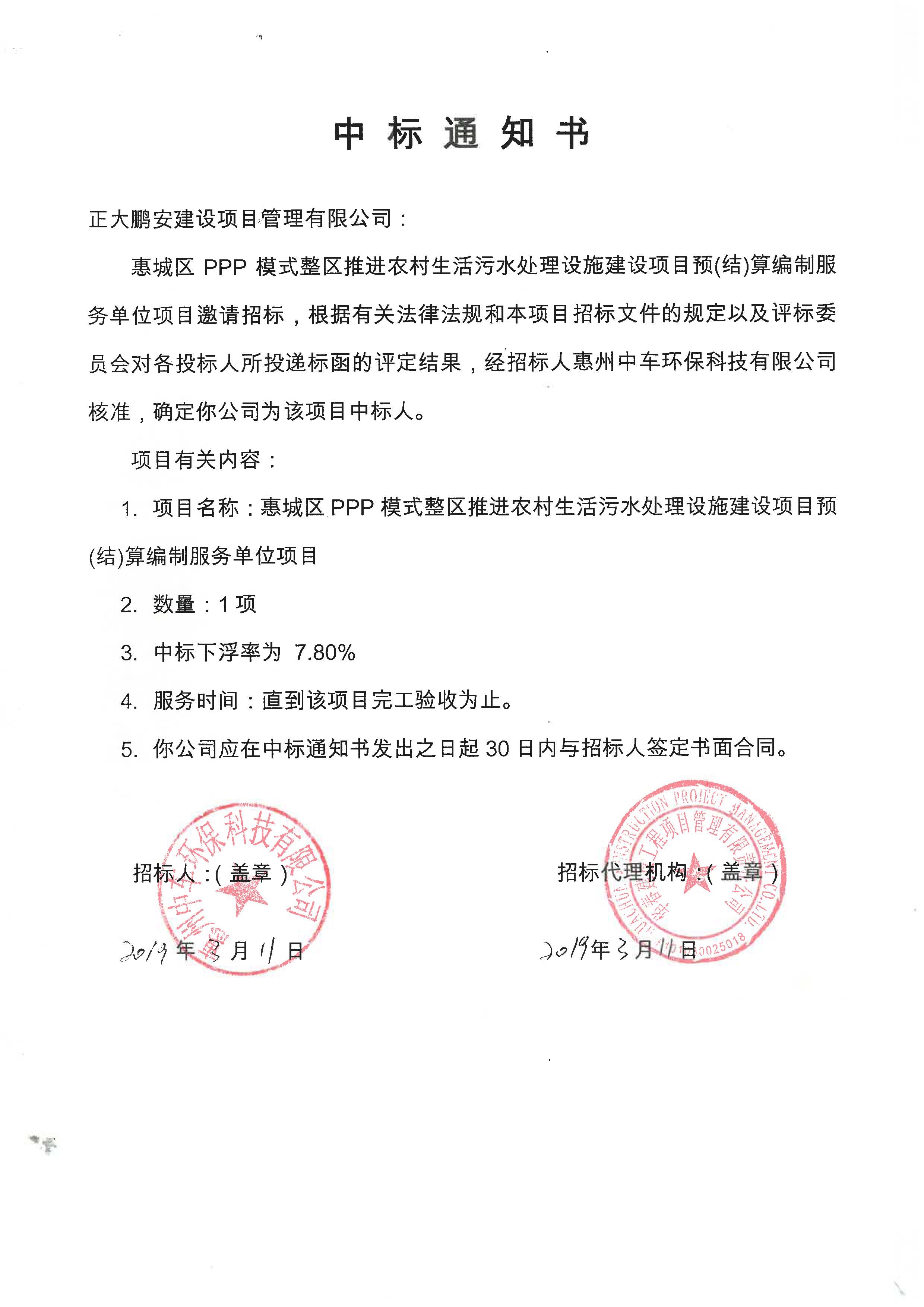 2019年3月,經(jīng)評(píng)標(biāo)委員會(huì)評(píng)定,招標(biāo)人確認(rèn),正大鵬安建設(shè)項(xiàng)目管理有限公司中標(biāo)惠城區(qū)PPP模式整區(qū)推進(jìn)農(nóng)村生活污水處理設(shè)施建設(shè)項(xiàng)目預(yù)(結(jié))算編制服務(wù)單位項(xiàng)目的中標(biāo)人。