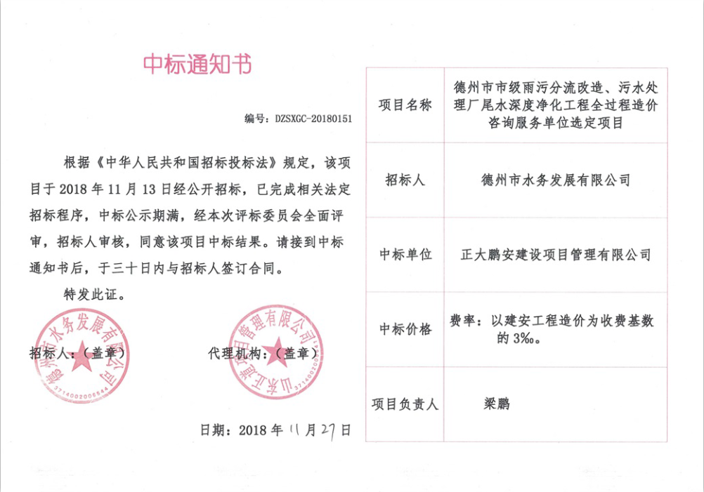 正大鵬安中標(biāo)德州市市級(jí)雨污分流改造、污水處理廠尾水深度凈化工程