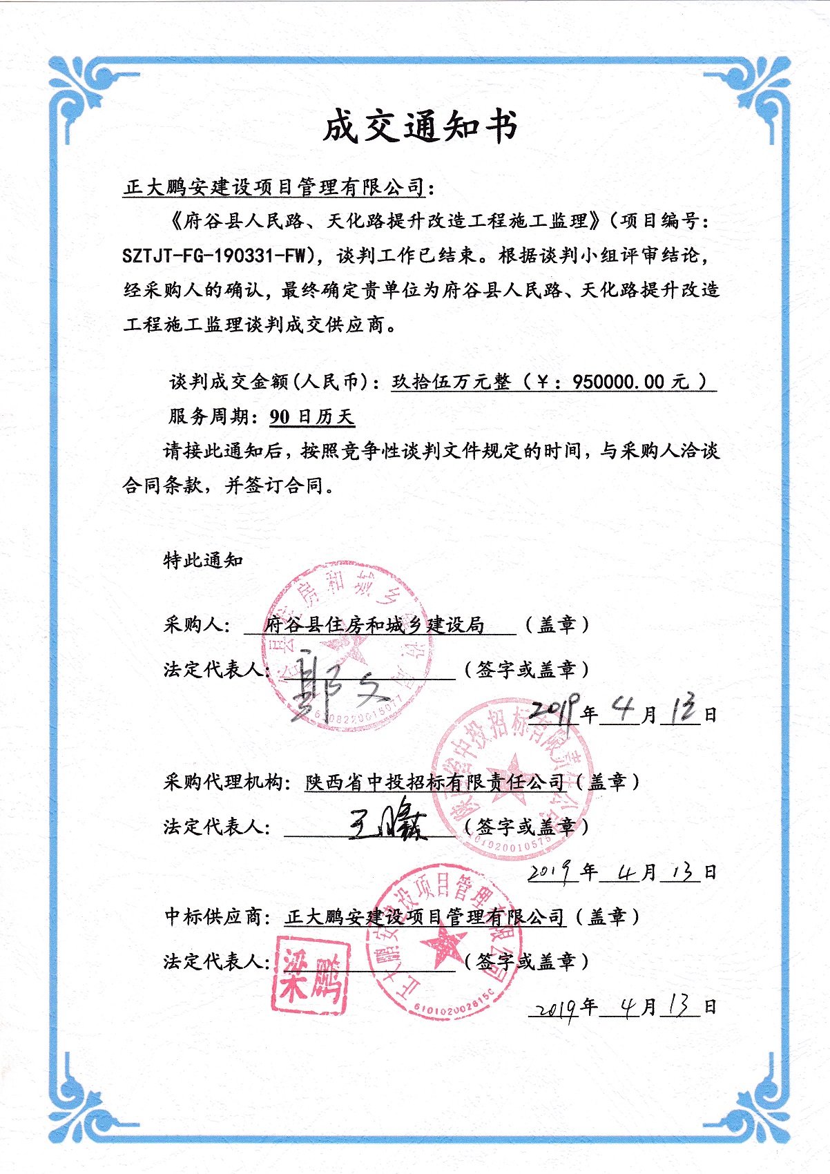 2019年4月,經(jīng)評(píng)標(biāo)委員會(huì)評(píng)定,招標(biāo)人確認(rèn),正大鵬安建設(shè)項(xiàng)目管理有限公司中標(biāo)府谷縣人民路、天化路提升改造工程施工監(jiān)理。