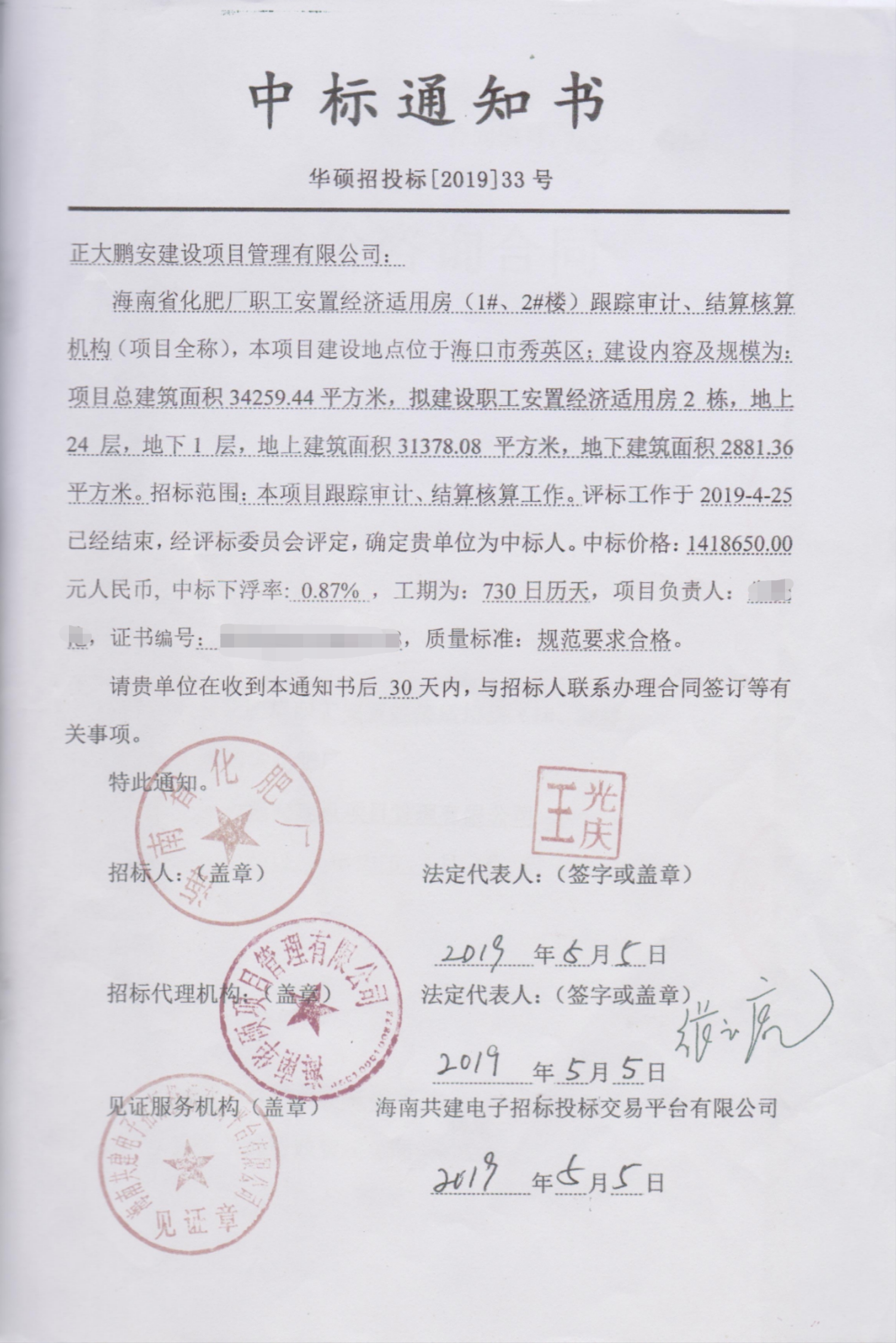 2019年5月5日,經(jīng)評(píng)標(biāo)委員會(huì)評(píng)定,招標(biāo)人確認(rèn),正大鵬安建設(shè)項(xiàng)目管理有限公司中標(biāo)海南省化肥廠職工安置經(jīng)濟(jì)適用房(1#、2#樓)跟蹤審計(jì)、結(jié)算核算項(xiàng)目。