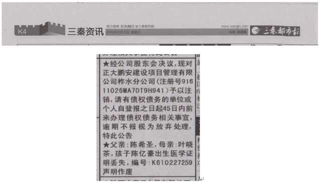 經(jīng)公司股東會決議,對正大鵬安建設(shè)項目管理有限公司柞水分公司(注冊號:91611026MA70T9H941)予以注銷,請有債權(quán)債務(wù)的單位和個人自登報之日起45日內(nèi)前來辦理相關(guān)事宜,逾期不報視為放棄處理,特此公告。