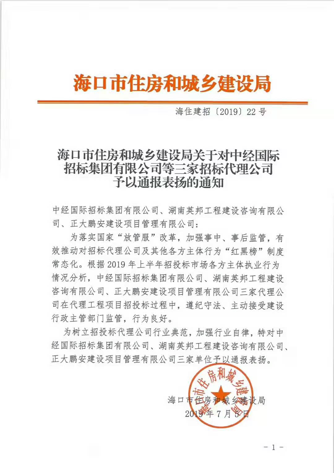 2019年7月5日,??谑凶》亢统青l(xiāng)建設(shè)局下發(fā)了關(guān)于對(duì)正大鵬安等三家招標(biāo)代理公司予以通報(bào)表?yè)P(yáng)的通知(海住建招〔2019〕22號(hào)),正大鵬安建設(shè)項(xiàng)目管理有限公司榮獲通報(bào)表?yè)P(yáng)。