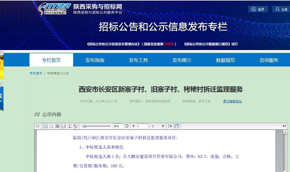 2019年11月,經(jīng)評標(biāo)委員會審定,招標(biāo)人確認,正大鵬安建設(shè)項目管理有限公司中標(biāo)。西安市長安區(qū)新寨子村、舊寨子村、栳栳村拆遷監(jiān)理服務(wù)。