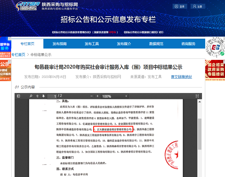 2020年4月,經(jīng)評標委員會評定,招標人確認,正大鵬安公司中標旬邑縣審計局2020年購買社會審計服務入庫(圍)項目。