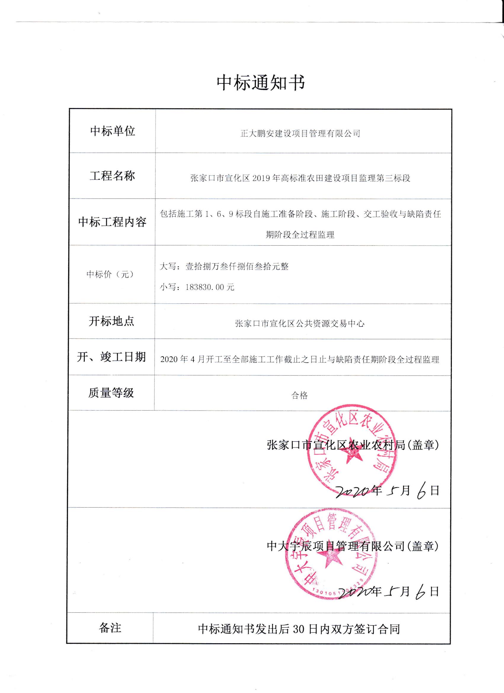 2020年5月6日,經(jīng)評(píng)標(biāo)委員會(huì)綜合評(píng)審,招標(biāo)人確認(rèn),正大鵬安中標(biāo)張家口市宣化區(qū)2019年高標(biāo)準(zhǔn)農(nóng)田建設(shè)項(xiàng)目監(jiān)理第三標(biāo)段。