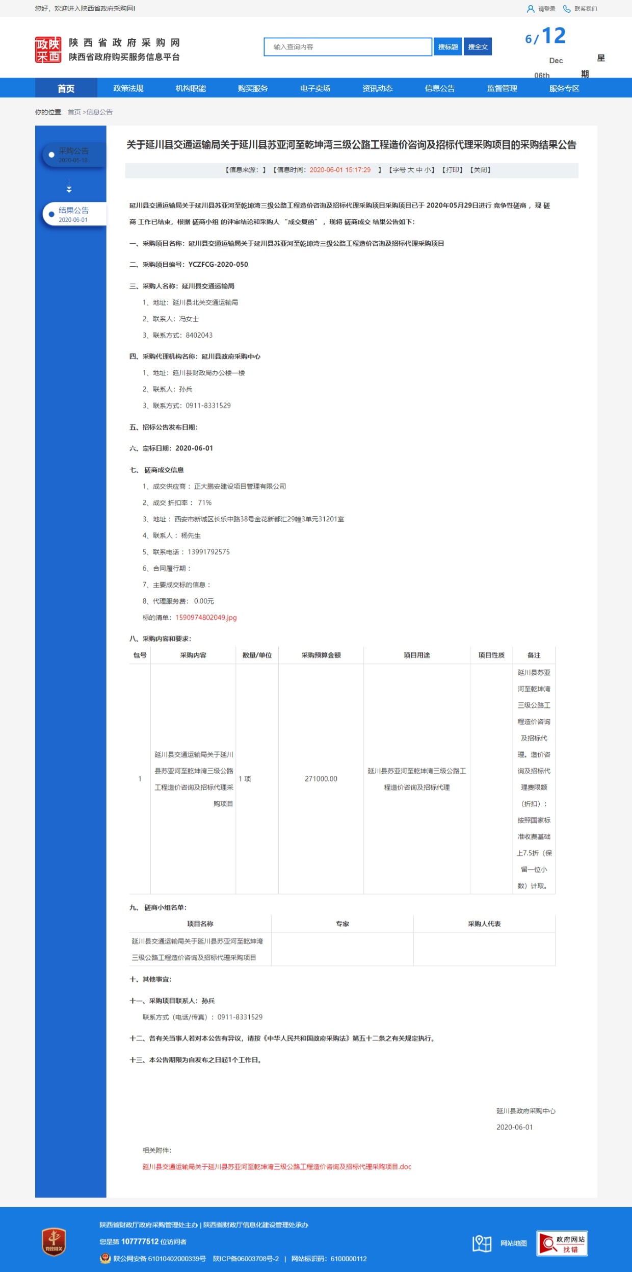 2020年5月29日,經(jīng)評(píng)標(biāo)委員會(huì)綜合評(píng)審,招標(biāo)人確認(rèn),正大鵬安建設(shè)項(xiàng)目管理有限公司中標(biāo)延川縣交通運(yùn)輸局關(guān)于延川縣蘇亞河至乾坤灣三級(jí)公路工程造價(jià)咨詢及招標(biāo)代理采購(gòu)項(xiàng)目。