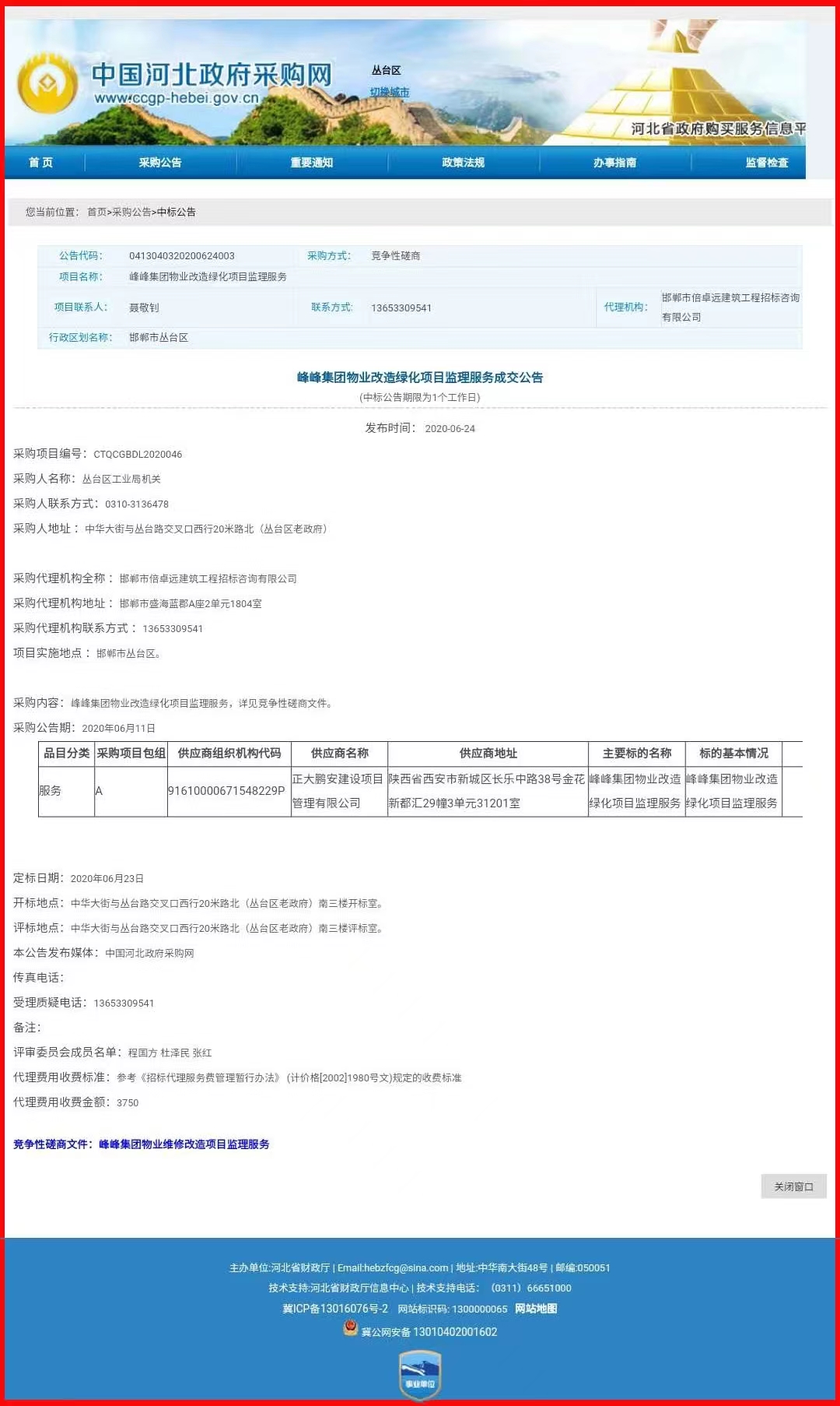 2020年6月,經(jīng)評(píng)標(biāo)委員會(huì)評(píng)定,招標(biāo)人確認(rèn),正大鵬安建設(shè)項(xiàng)目管理有限公司中標(biāo)邯鄲市叢臺(tái)區(qū)工業(yè)局的“峰峰集團(tuán)物業(yè)改造綠化項(xiàng)目監(jiān)理服務(wù)”項(xiàng)目。