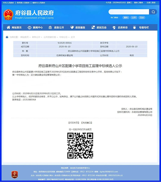 6月9日榆林市府谷縣住房和城鄉(xiāng)建設局委托第三方,就“府谷縣新府山片區(qū)配建小學項目監(jiān)理”進行了公開招標,經(jīng)評標委員會綜合評審,采購人確認,正大鵬安公司中標該項目。