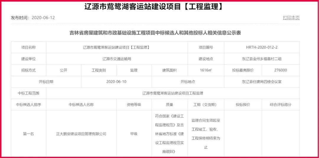 6月10日吉林省遼源市交通運輸局委托第三方,就“遼源市鴜鷺湖客運站建設(shè)項目工程監(jiān)理”(項目編號:HRTH-2020-012-2)進行了公開招標,正大鵬安公司中標該項目。