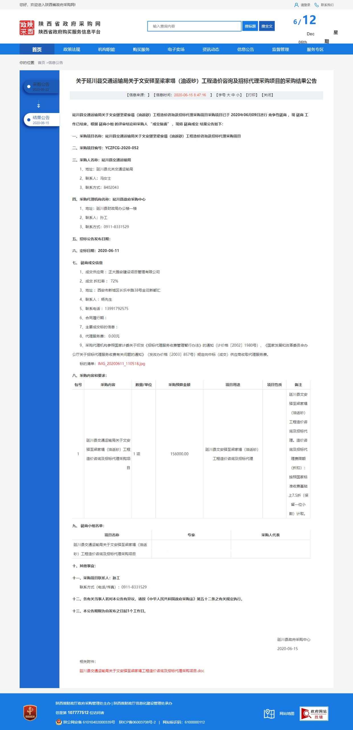 2020年6月9日,經(jīng)評(píng)標(biāo)委員會(huì)綜合評(píng)審,招標(biāo)人確認(rèn),正大鵬安建設(shè)項(xiàng)目管理有限公司中標(biāo)延川縣交通運(yùn)輸局關(guān)于文安驛至梁家塌(油返砂)工程造價(jià)咨詢及招標(biāo)代理采購(gòu)項(xiàng)目。