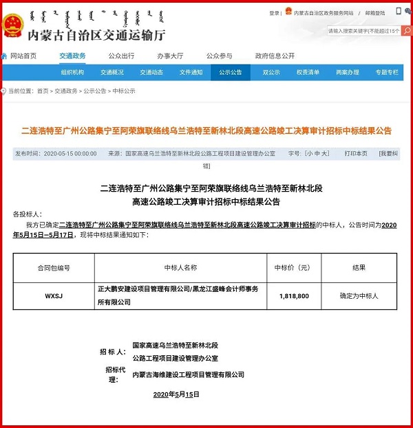 正大鵬安公司中標(biāo)二連浩特至廣州公路集寧至阿榮旗聯(lián)絡(luò)線烏蘭浩特至新林北段高速公路竣工決算審計(jì)招標(biāo)項(xiàng)目