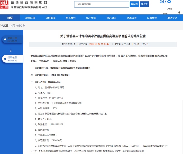 2020年6月12日,經(jīng)評標委員會綜合評審,招標人確認,正大鵬安中標澄城縣審計局購買審計服務(wù)供應(yīng)商遴選項目。