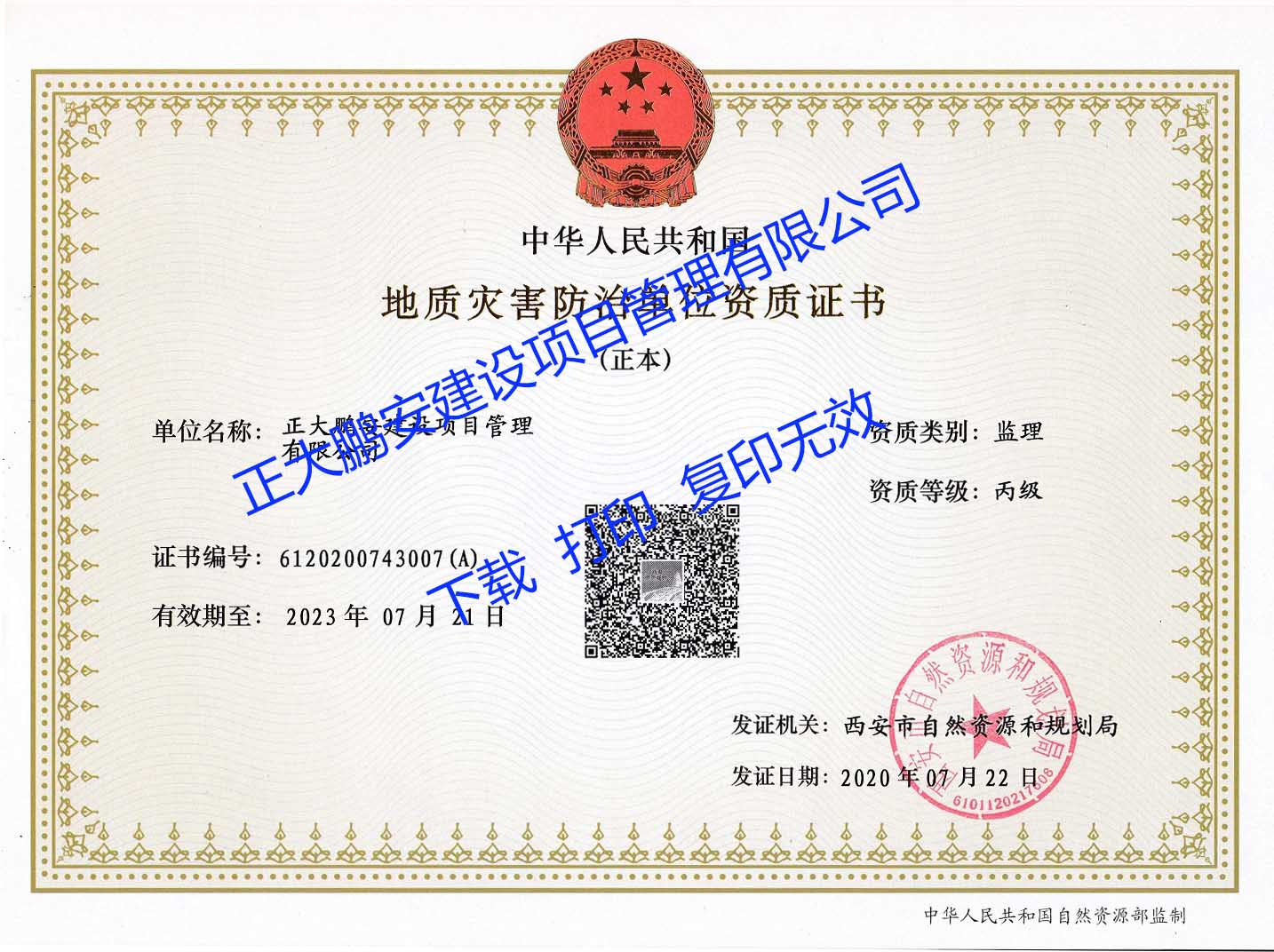 2020年7月24日西安市自然資源和規(guī)劃局發(fā)布《地質(zhì)災(zāi)害防治乙、丙級(jí)資質(zhì)新設(shè)、延續(xù)和升級(jí)審批結(jié)果公告》,正大鵬安公司地質(zhì)災(zāi)害防治單位監(jiān)理丙級(jí)資質(zhì)獲得批準(zhǔn)。