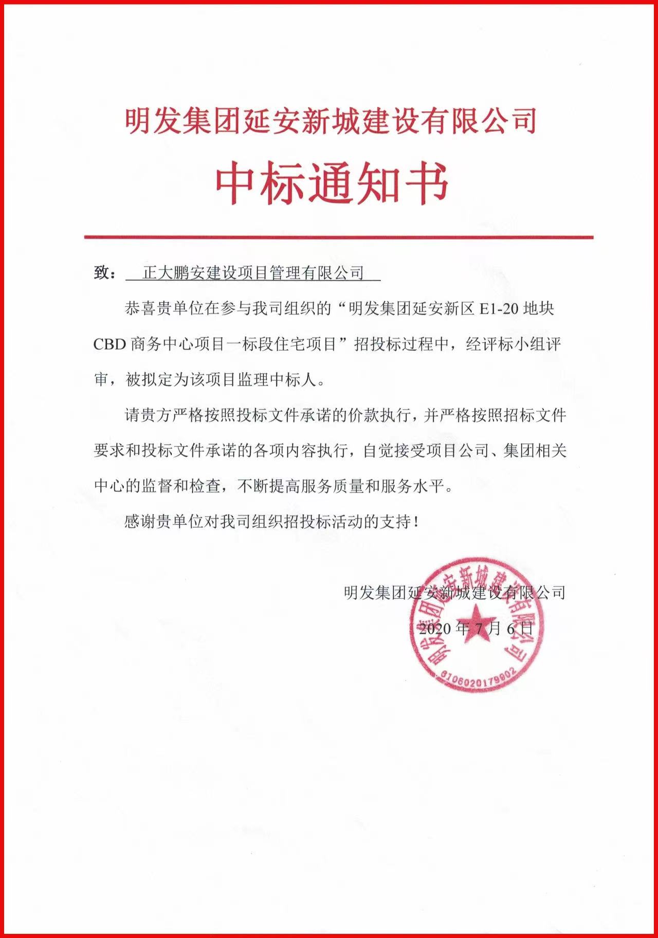 近期,我公司參與了明發(fā)集團(tuán)延安新區(qū)E1-20地塊CBD商務(wù)中心項(xiàng)目一標(biāo)段住宅項(xiàng)目的投標(biāo),經(jīng)評(píng)標(biāo)委員會(huì)綜合評(píng)審,招標(biāo)人確認(rèn),正大鵬安建設(shè)項(xiàng)目管理有限公司被確認(rèn)為中標(biāo)單位。