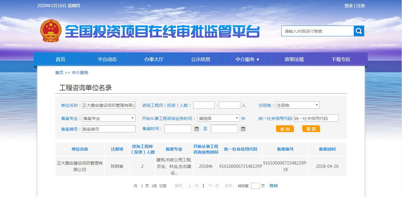 公司通過全國投資項目在線審批監(jiān)管平臺工程咨詢網(wǎng)上登記