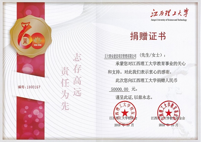 2018年10月正大鵬安建設(shè)項(xiàng)目管理有限公司向院校教育基金捐款