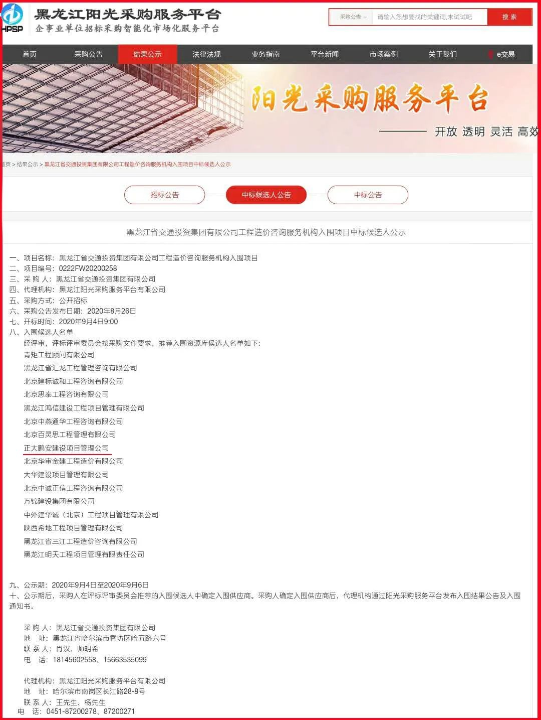 正大鵬安入圍黑龍江省交通投資集團(tuán)有限公司工程造價(jià)咨詢(xún)服務(wù)機(jī)構(gòu)項(xiàng)目