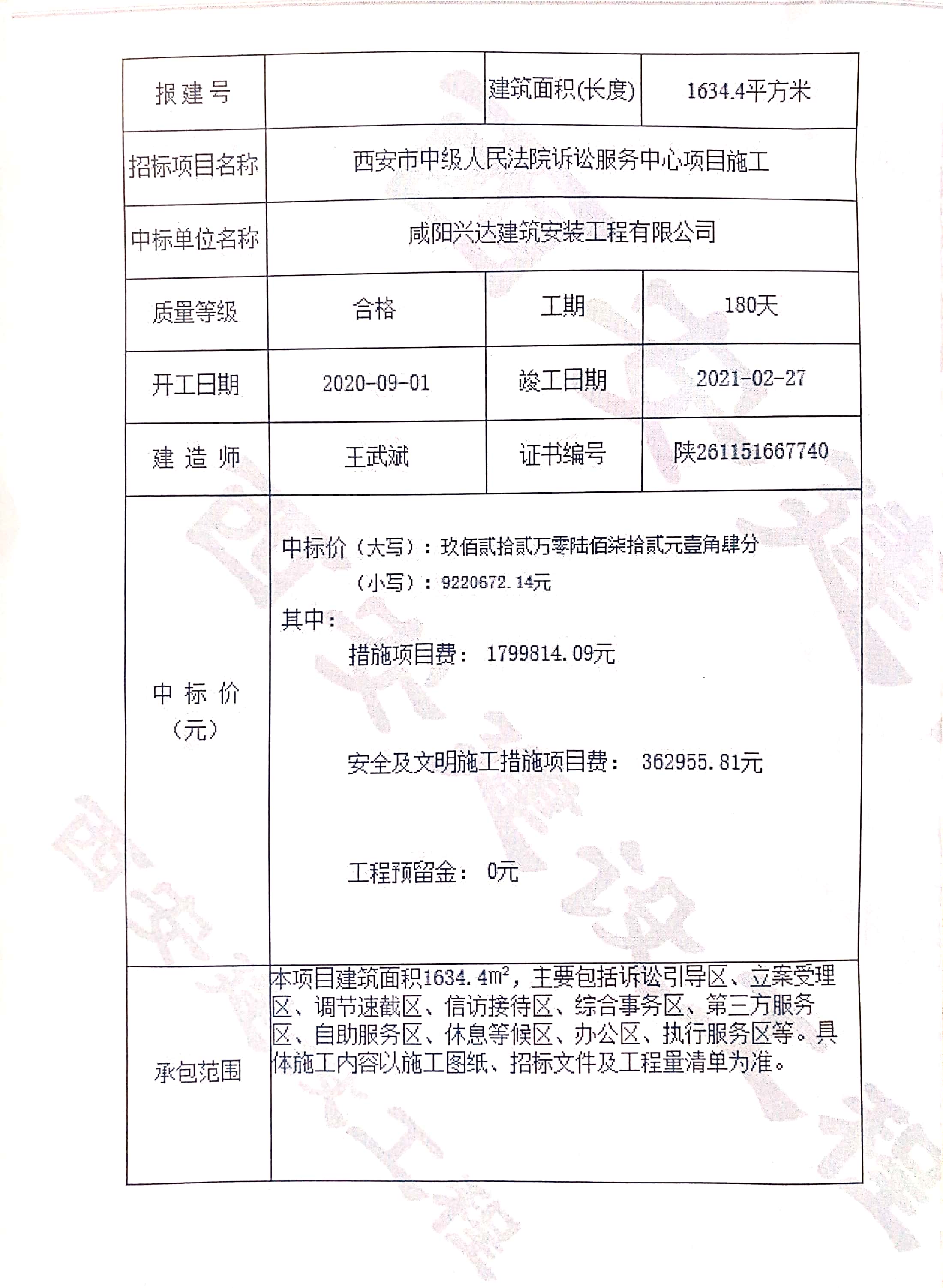 西安市中級(jí)人民法院訴訟服務(wù)中心施工及監(jiān)理項(xiàng)目
