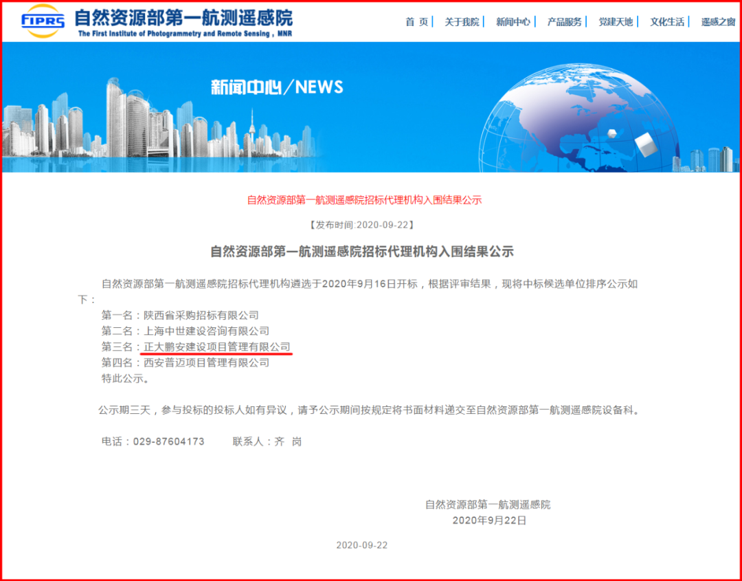 9月16日,自然資源部就第一航測遙感院招標代理機構入圍項目”進行公開招標,經評標委員會綜合評審,采購人確認,正大鵬安公司入圍該項目。