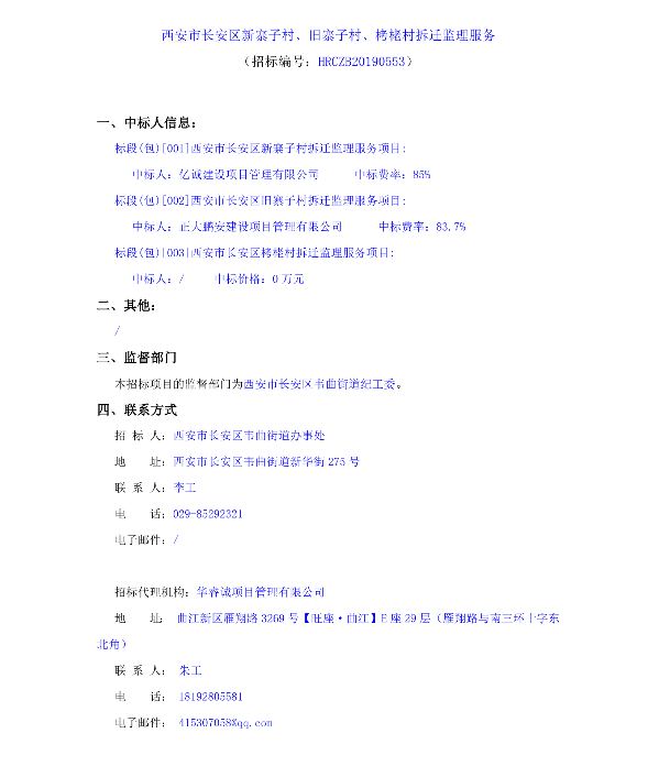 2019年11月,經(jīng)評標(biāo)委員會審定,招標(biāo)人確認(rèn),正大鵬安建設(shè)項目管理有限公司中標(biāo)西安市長安區(qū)舊寨子村拆遷監(jiān)理服務(wù)。