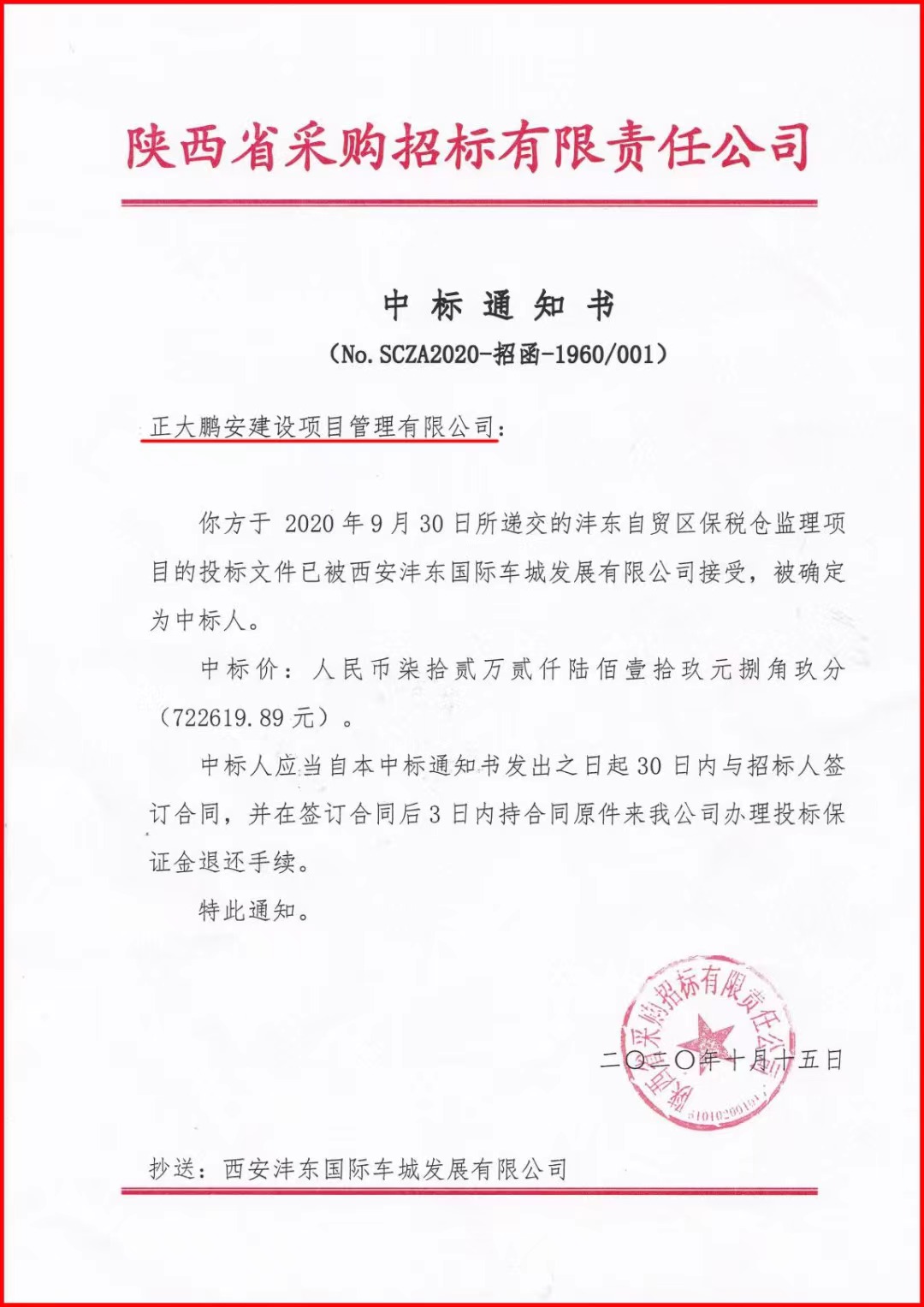 2020年9月,經(jīng)評標委員會評定,招標人確認,正大鵬安建設項目管理有限公司中標西安灃東國際車城發(fā)展有限公司的“灃東自貿(mào)區(qū)保稅倉監(jiān)理”項目。