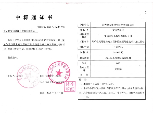 近日,某單位對“某單位某場地土建工程和監(jiān)控系統(tǒng)建設(shè)項(xiàng)目”進(jìn)行公開招標(biāo),經(jīng)評標(biāo)委員會綜合評審,招標(biāo)人確認(rèn),正大鵬安建設(shè)項(xiàng)目管理有限公司中標(biāo)。