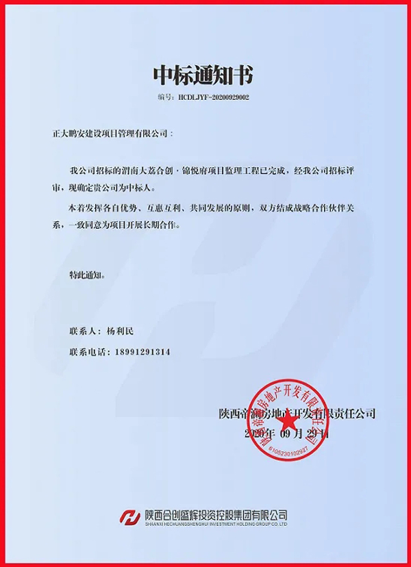正大鵬安公司中標陜西渭南大荔合創(chuàng)?錦悅府監(jiān)理項目