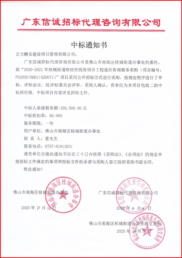 近日,佛山市南海區(qū)桂城街道辦事處委托第三方就“2020-2021年桂城街道財政性投資項目工程造價咨詢服務采購(項目編號:FS2020(NH01)XZ0071)”進行公開招標,經評標委員會綜合評審,采購人確認,正大鵬安公司入圍該項目。