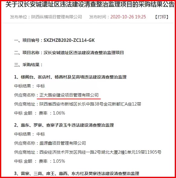 2020年10月,經(jīng)評(píng)標(biāo)委員會(huì)評(píng)定,招標(biāo)人確認(rèn),正大鵬安建設(shè)項(xiàng)目管理有限公司中標(biāo)西安市未央?yún)^(qū)漢城街道辦事處的“漢長(zhǎng)安城遺址區(qū)違法建設(shè)清查整治監(jiān)理”項(xiàng)目。