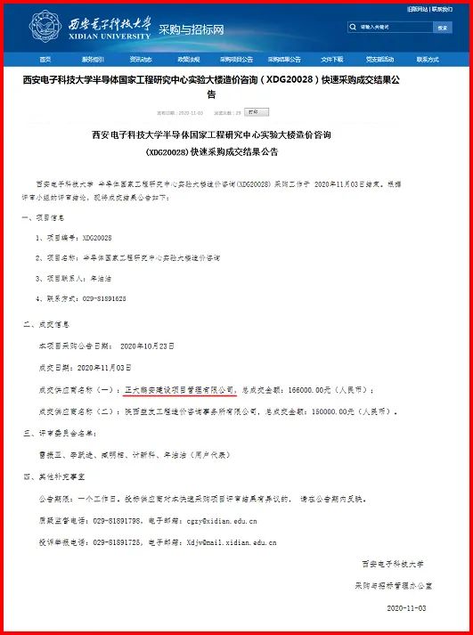 11月3日,我公司參與投標(biāo)西安電子科技大學(xué)半導(dǎo)體國(guó)家工程研究中心實(shí)驗(yàn)大樓造價(jià)咨詢(xún)項(xiàng)目,經(jīng)評(píng)審委員會(huì)綜合評(píng)審,招標(biāo)人確認(rèn),正大鵬安建設(shè)項(xiàng)目管理有限公司中標(biāo)。