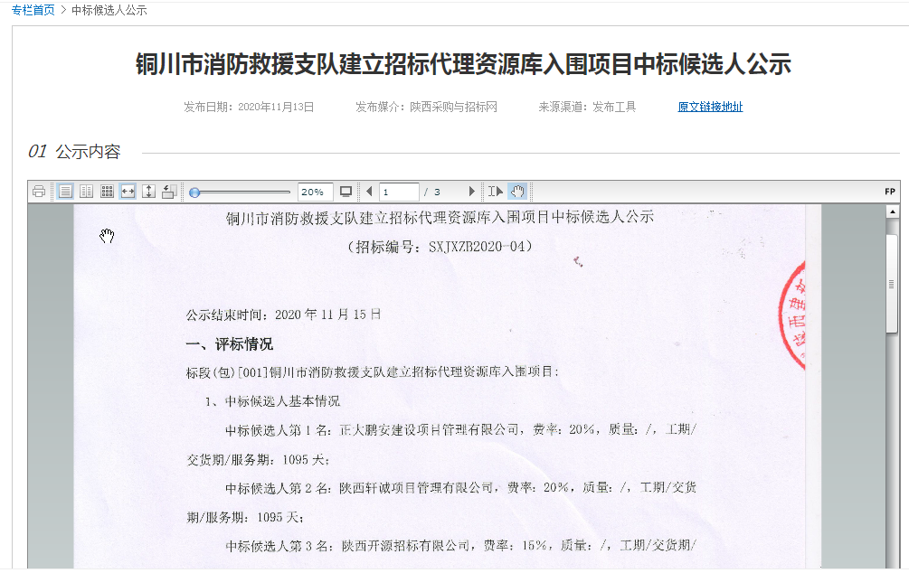 2020年11月10日,我公司參與“銅川市消防救援支隊建立招標代理資源庫入圍項目”招標項目,經評審委員會綜合評審,招標人確認,正大鵬安公司入圍該項目。服務期限:三年