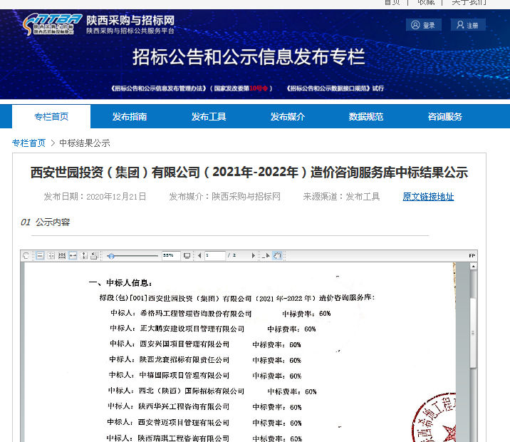 2020年12月,我公司參與“西安世園投資(集團)有限公司(2021年-2022年)造價咨詢服務(wù)庫”招標(biāo)項目,經(jīng)評審委員會綜合評審,招標(biāo)人確認,正大鵬安公司入圍該項目。